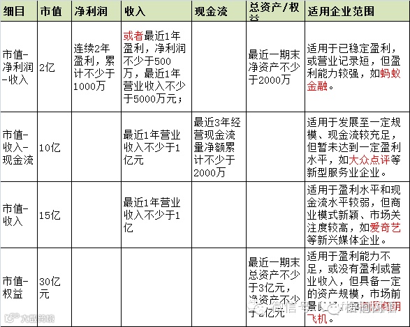 财务标准。新兴板设置“市值-净利润-收入”、“市值-收入-现金流”、“市值-权益”等4套以市值为核心的上市财务标准,具体标准详见下表: