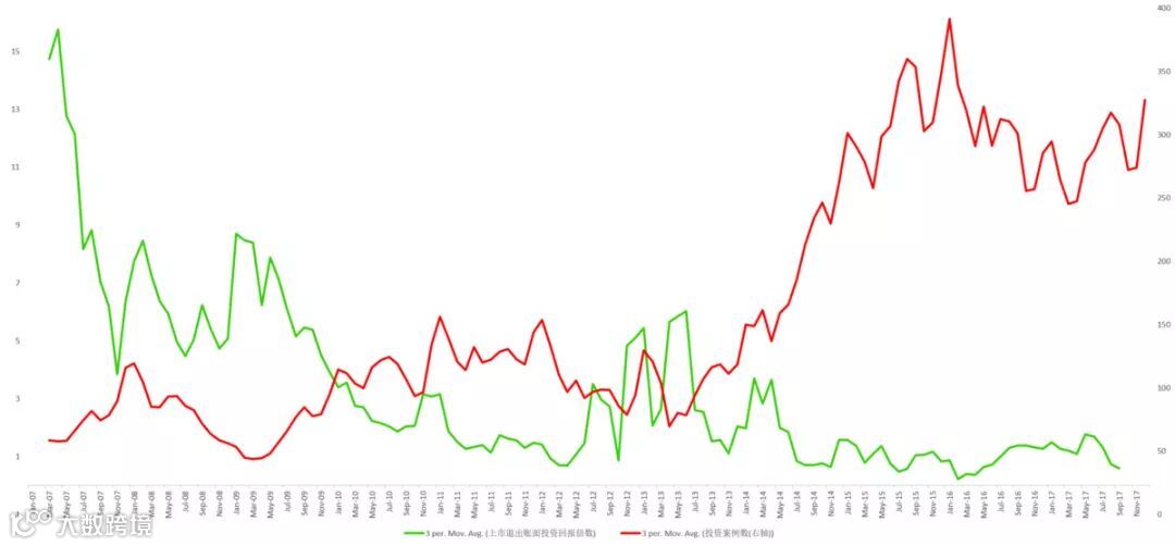 这份统计计算了从2007年至2017年,基金通过上市退出和非上市退出的账面投资回报倍数,以投资案例数作为市场热度的判断指标。由于数据披露不完全,本次统计的绝对数字不一定精确,但十年间数据的趋势仍有借鉴意义。
