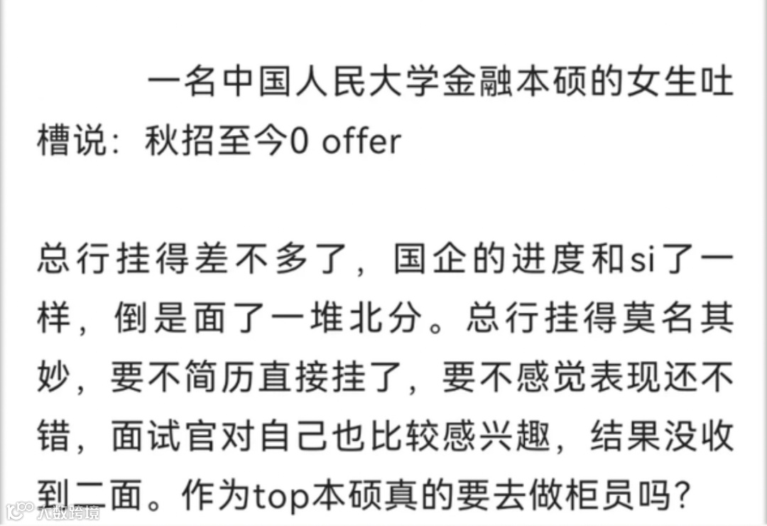 中国人民大学的金融类专业,在国内是前三的地位,人大本硕毕业生在就业市场竞争力还是杠杠的的,但是在今年秋招居然也吃了瘪,原本计划的职业方向,有泡汤的可能了!