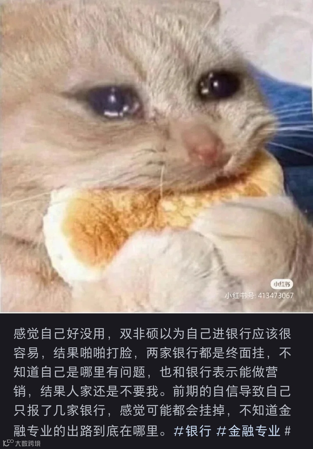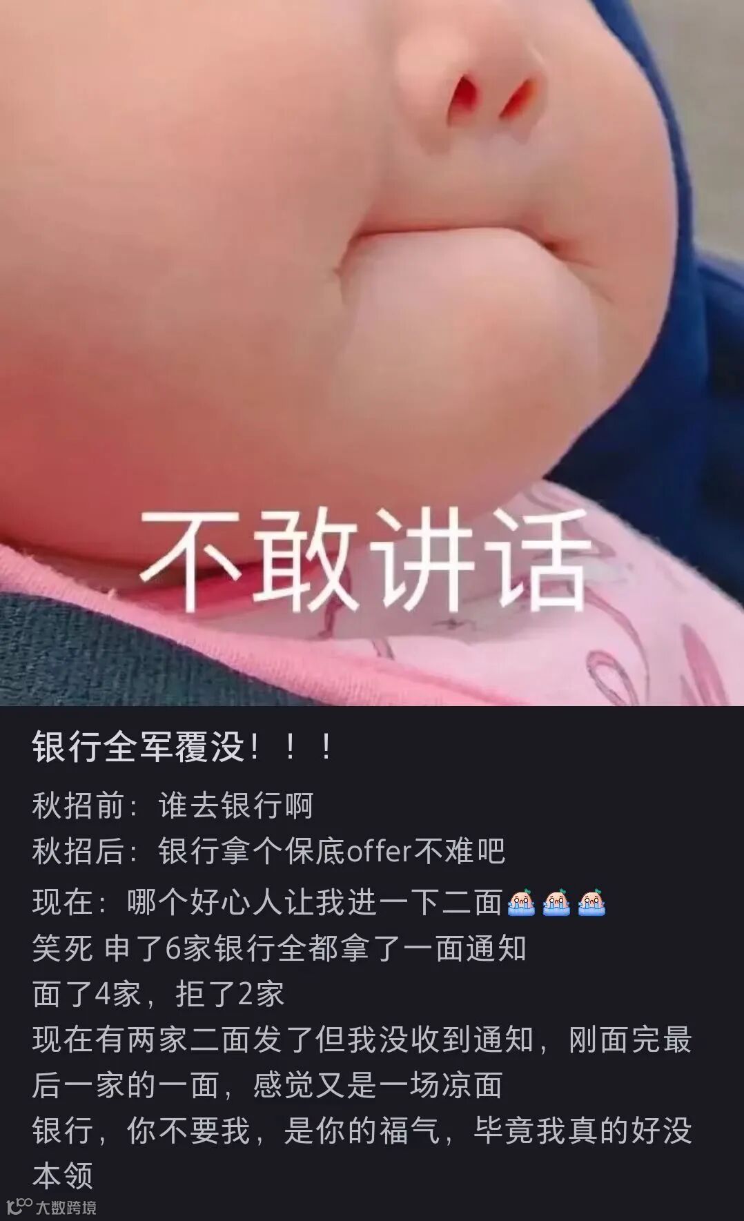 久久说:本来觉得自己进银行应该很容易的,结果却打脸了,申了6家银行,全部拿了一面通知,面了4家,被拒了2家。