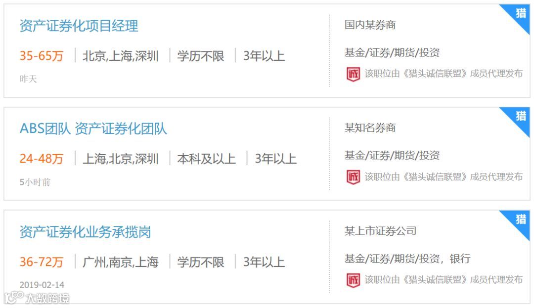 在如此受重视的市场环境下,ABS相关职位的薪酬水平一般高于行业平均之上。从招聘网站信息来看,有三年工作经验的资产证券化项目经理或团队负责人的年薪大约在30-60万之间。国内排名前列的券商或资管公司资产证券化业务总经理类职务,年薪百万收入可期。