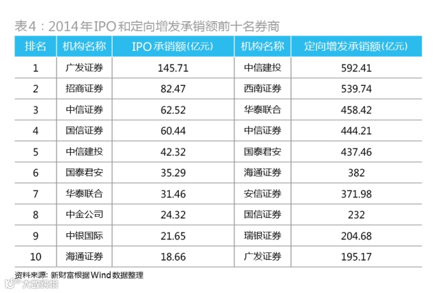 以2014年IPO和定向增发承销额前十名券商为例,同在名单的有:中信证券(分别排名第3和4位)、国信证券(排名第4和8位)、中信建投(排名第5和1位)、国泰君安(排名第6和5位)、华泰联合(排名第7和3位)、海通证券(排名第10和6位)、广发证券(排名第1和10位),而IPO业务2014年位居第2位的招商证券,却未能挤入定向增发的TOP10(表4)。
