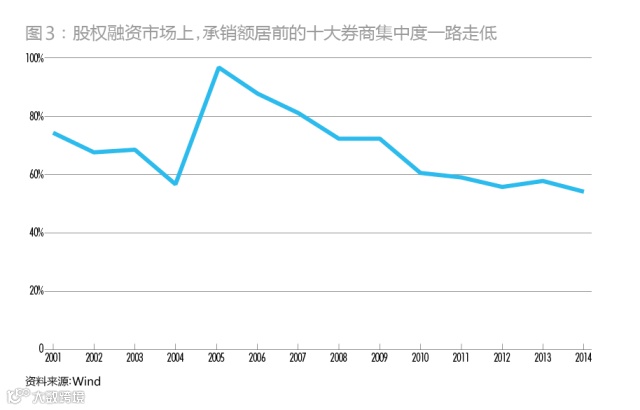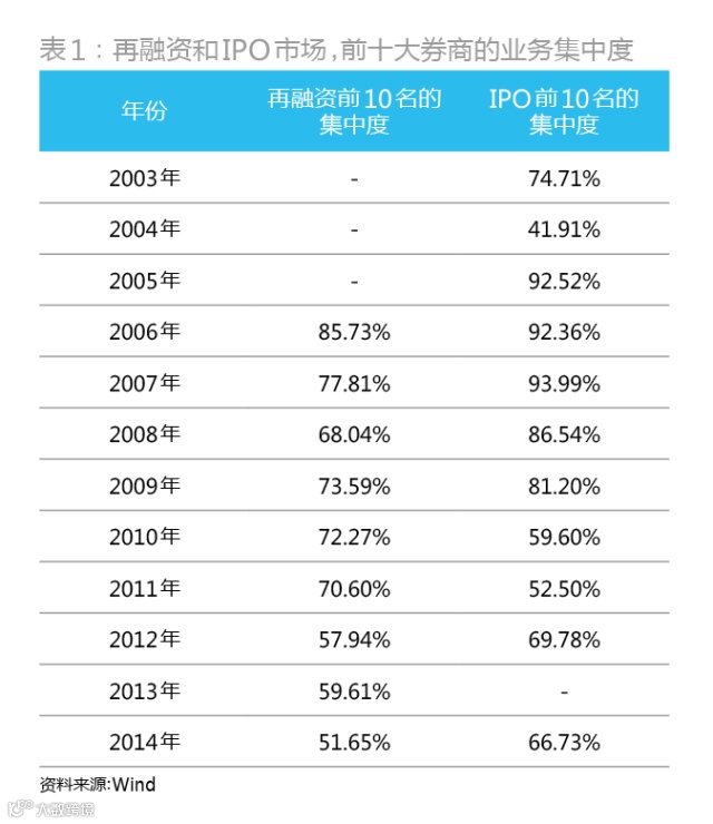 然而,参与其中的券商,却几经变换,名次不断更迭。以股权融资为例,承销额居前的十大券商的集中度(CR10)近年不升反降,在2005年达到巅峰,为96.39%,但最近几年集中度一路走低,2014年降至53.92%(图3)。在IPO和再融资领域,承销额居前的十大投行的业务集中度亦均未能幸免走低趋势(表1)。