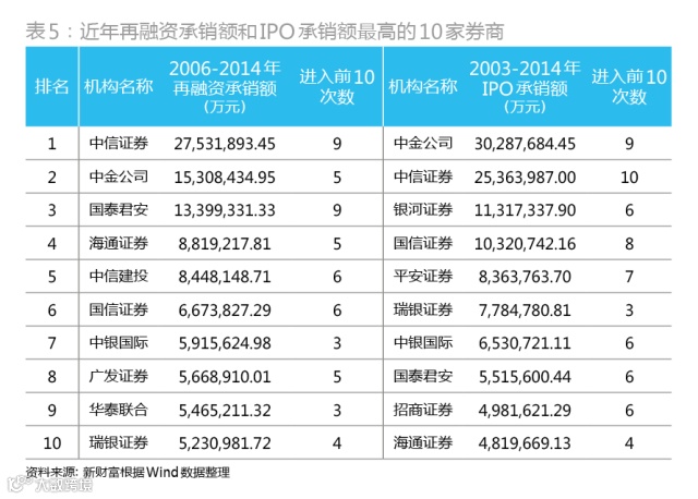 2006至2014年再融资承销额最强的10家券商,只有中信证券和国泰君安每年均能进入前十,国信证券和中信建投有6年进入前十;而2003至2014年的IPO前十,只有中信、中金和国信有8年以上进入前十(表5)。
