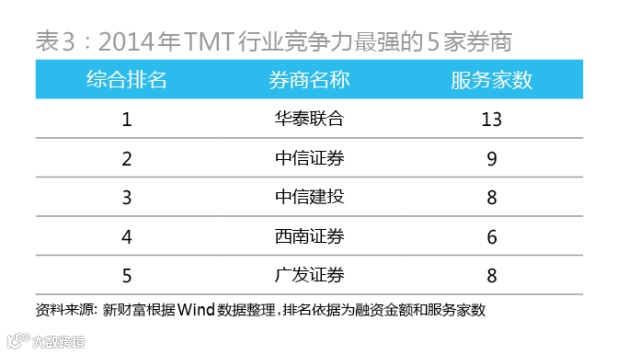 不妨来检验一下,行业分组是否有助于券商提升投行业务的竞争力。以2014年非常火爆的TMT行业为例进行观察,可以发现,行业分组的确形成了一定的业务聚拢效应。加总承销金额和服务家数,排名前五的券商中,华泰联合服务过的上市公司达到13家,是目前TMT行业股权融资和财务顾问服务最强的一家券商。广发证券服务的上市公司达到8家,中信证券和中信建投也分别服务过9家和8家上市公司(表3)。