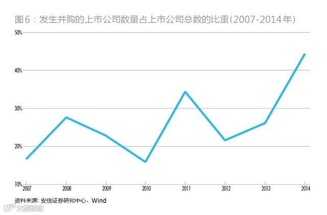 有趣的是,在这一轮产业并购浪潮中,创业板和中小板上市的民营企业担当大任,2014年在808家上市公司为主体的并购中,有59%,即475家是在中小板和创业板上的上市公司;而据安信证券和Wind的数据,2014年在2000多家上市公司中有44.1%发生了并购,2007年这一数据是16.6%(图6)。