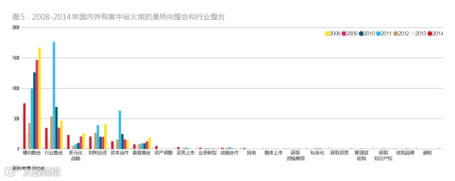 据投行人士介绍,2010年后,创业板上市公司的心态发生了变化,产业并购才开始渐成规模;至2013年,并购市场的参与各方逐步意识到,通过并购成长是企业发展的常态,是不可改变的大趋势,因为时代给予企业通过募资自建产业、逐步成长的机会越来越少。Wind数据显示,对2014年国内已完成并购事件的统计发现,其最主要的并购目的是横向整合、行业整合、多元化战略,71%的并购都是通过这三大路径展开的(表2)。2008到2014年的6年间,中国并购市场也以横向整合和行业整合的案例居多(图5)。