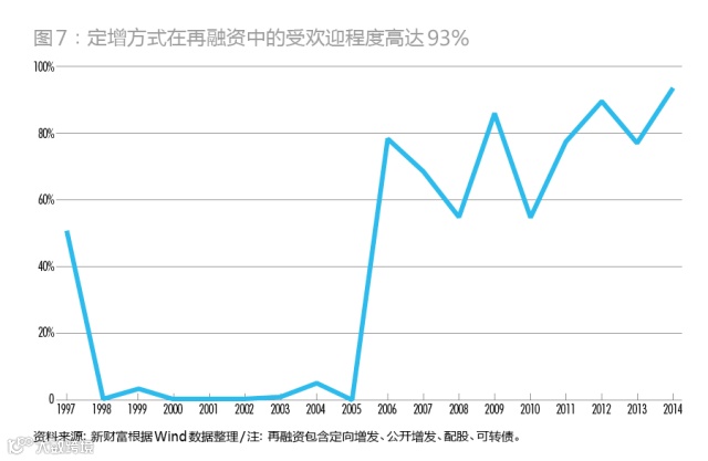 目前在中国,主要采用的方式是第一和第二种。定向增发作为一种应用最多的再融资方式,在并购井喷中起到重要的撬动作用。2014年,92.88%的再融资是以定向增发的形式进行的,如果剔除掉可转债的股权再融资,97.89%的融资都选择了定向增发方式(图7)。