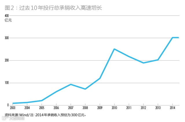 据Wind资讯统计,国内投行的总承销收入从2003年的9.5亿元扩张到2013年的201.66亿元,以及2014年中期的102亿元;而中信建投和国泰君安2014年全年承销收入分别达到17.4亿元和15.85亿元,是2014年上半年的3倍。以此估算,2014年全年整个证券行业的承销收入可达300亿元。