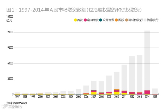 2014年,有1/4强的并购配套融资通过定向增发完成。根据Wind的统计,2014年A股的定向增发融资总额为6610亿元,其中2869亿元来自财务顾问项目,其中的2635亿元用于资产收购,是并购中所产生的配套融资。2014年已完成的并购金额11088亿元,由此可以推算出,有25.87%的并购配套融资通过定向增发获得满足。如果剔除境外融资及阿里巴巴(BABA.NYSE)、腾讯(00700.HK)、百度(BIDU.NSDQ)等海外上市公司的并购金额,这一比例还会高得多。