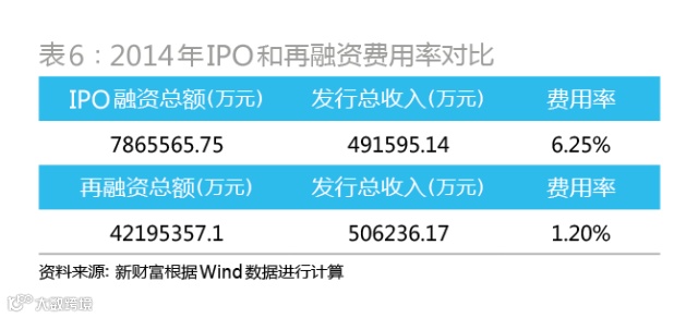 另外一个原因是,IPO的发行收入远远大于再融资。2014年投行从IPO的融资额中能收取6.25%的承销费用,而只能从再融资项目中只能收到1.2%的承销费用(表6)。对业绩的考量,使得部分投行将主要资源放在IPO上,而忽略了其他业务的均衡发展。