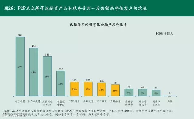 :近80%的中国高净值人士正在使用数字化的金融产品和服务。在尚未使用的人群中,35%的高净值人士明确表示愿意尝试。在已经使用的数字化产品和服务中,与“互联网金融主要服务屌丝”的印象相悖,36%的高净值人士购买过互联网理财产品,P2P及众筹等以服务长尾客户著称的电子化产品也受到了超过10%的高净值客户欢迎(参阅图25和26)。