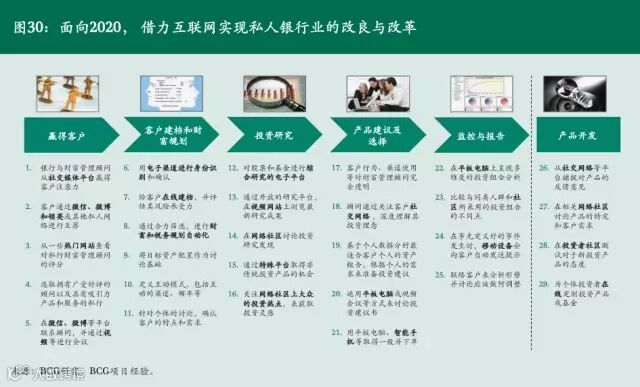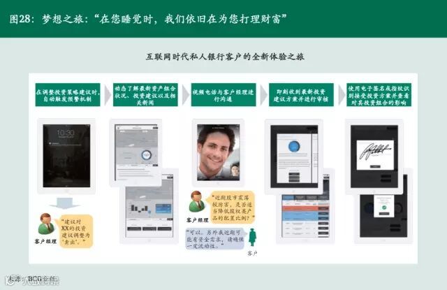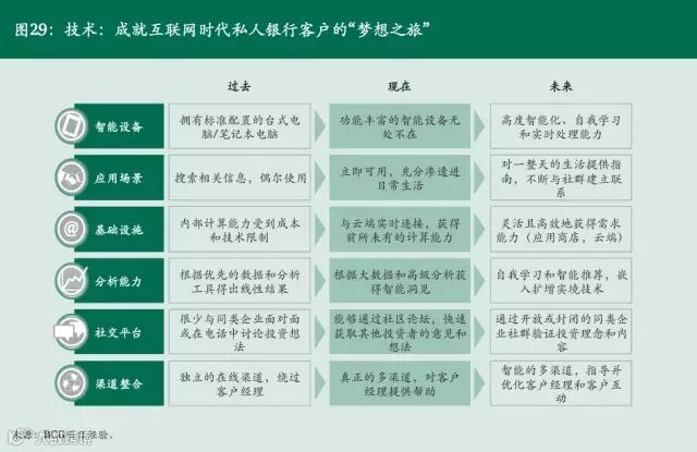 。可以看出,实现这样的梦想之旅,私人银行需要围绕客户需求“端到端”全面重新设计与客户的互动流程,并大幅应用互联网化的技术手段以支撑全新的体验。而这些技术手段,已然就绪(参阅图28)。