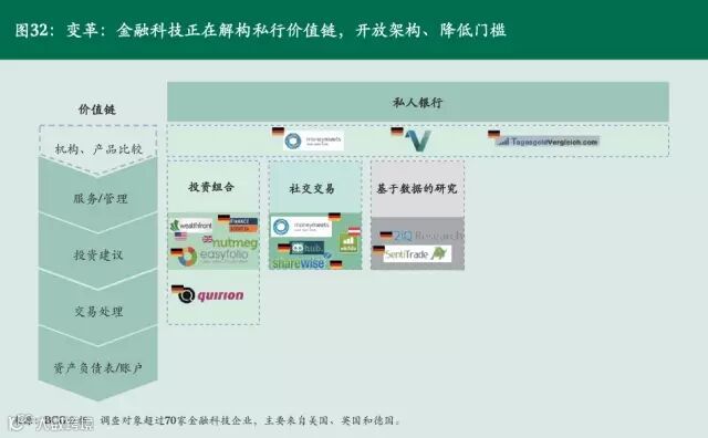 在互联网浪潮的不断冲刷下,私人银行业务价值链正在出现深度解构。在海外,以“FinTech”(“金融科技”)为代名词的互联网金融创新不断涌现,并进入到私人银行的细分领域。这些金融创新专攻传统金融机构往往表现不佳的环节,例如资讯、投资建议、增值服务、组合管理等,