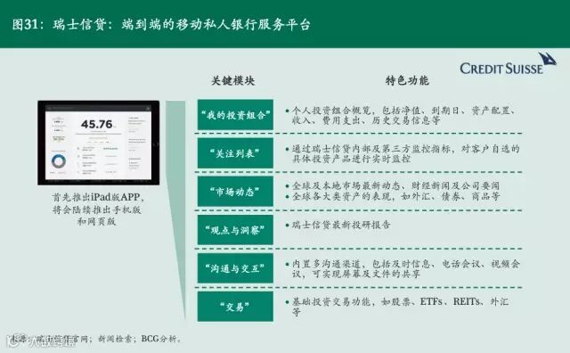 银行(BNPP)开发了手机软件支持定量投资组合在移动端的分析与模拟功能;美银美林银行(BoA)重点推广虚拟互动技术的应用,使客户可以在任何时间和地点与客户经理通过视频会议进行面对面的沟通;而瑞士信贷(Credit Suisse)更是向前一步,为私人银行客户提供端到端全方位的移动服务平台,涵盖从资讯到配置建议、组合监控、交易完成的全部主要环节(参阅图31)。