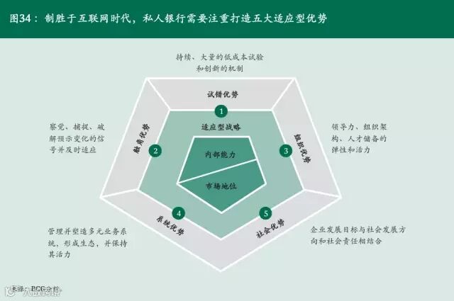 时代如此,尚年幼的中国私人银行业会发现自己没有可以拿来照搬的“成功模式”,而是需要抱着创新创业的心态,跨界学习互联网时代领先企业胜出的关键优势,成就自身的做大做强。总结而言,这样的“适应型”优势将体现在五大方面(参阅图34):
