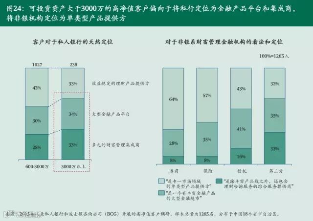 ,部分中高净值客户(约33%)则已开始视其为多元的财富管理集成商,私人银行综合金融服务能力被逐渐认可;而券商、保险及信托等非银行系金融机构则仍因其特色产品,被定位为专一市场的单类型产品提供方;第三方财富管理机构的定位则与银行系私行较为接近,多以金融产品超市或多元财富管理集成商的形象参与市场竞争(参阅图24)。