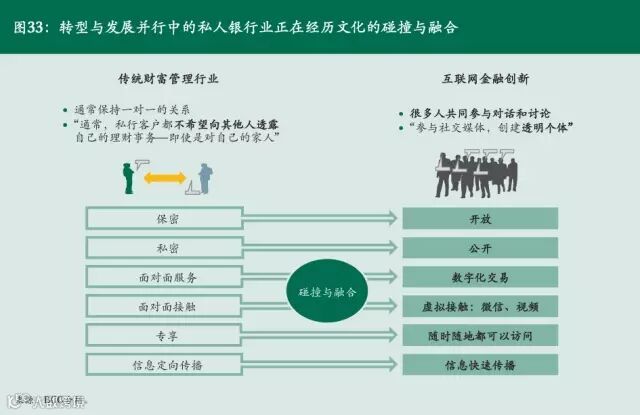 传统财富管理行业的“私密、面对面、专享、定向”遇见了互联网的“开放、虚拟、随时随地、信息共享”(参阅图33)。