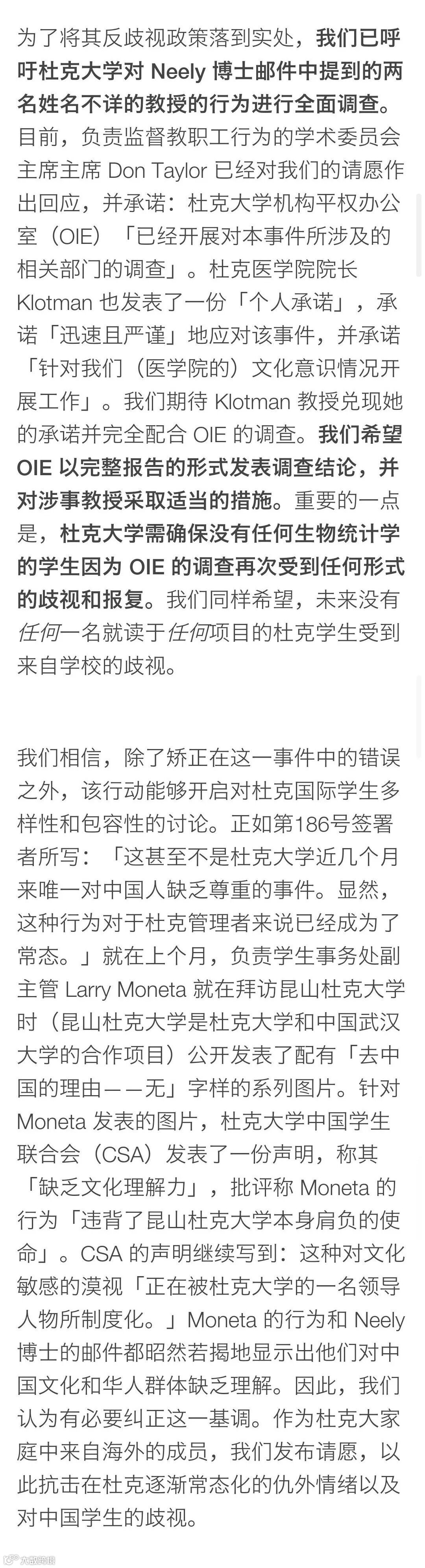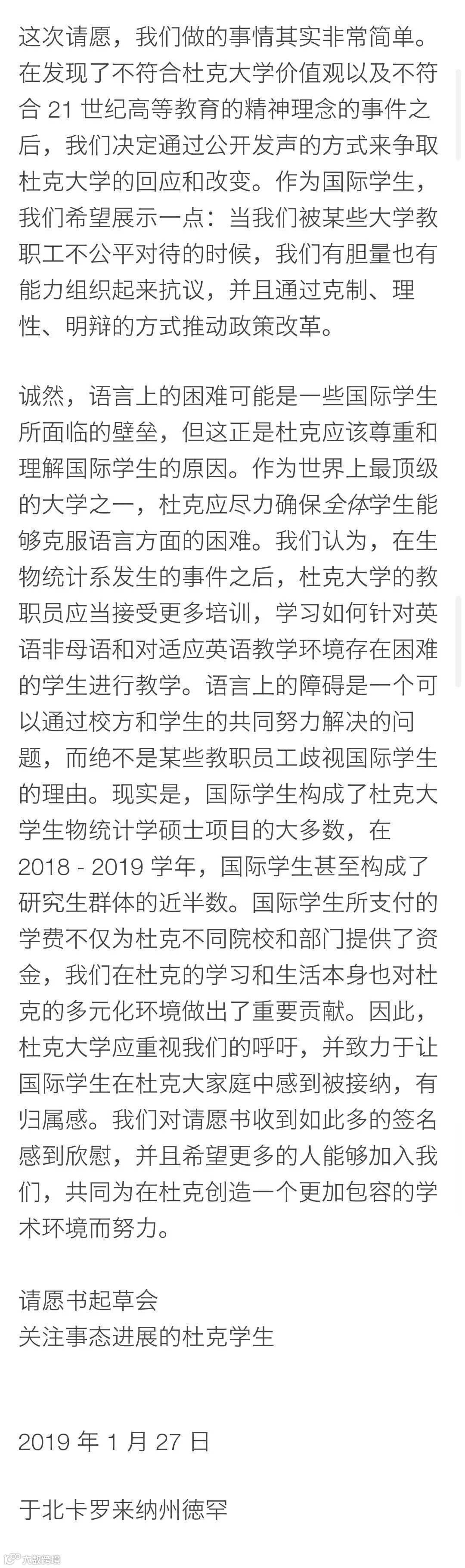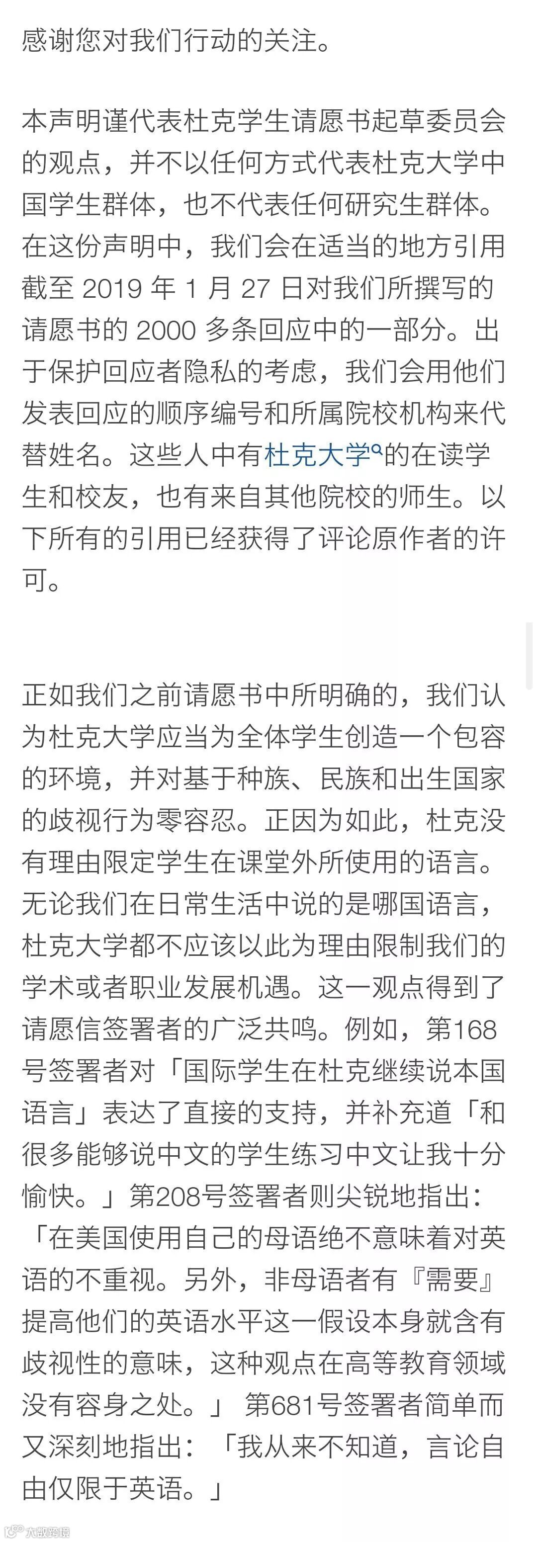 最后和大家分享一下杜克大学禁说中文事件里中国留学生们的请愿书。可以看出起草者有着非常优秀的个人素养,文字有理有据,语言不卑不亢,这也正是在异乡面对歧视时应有的心理和态度。