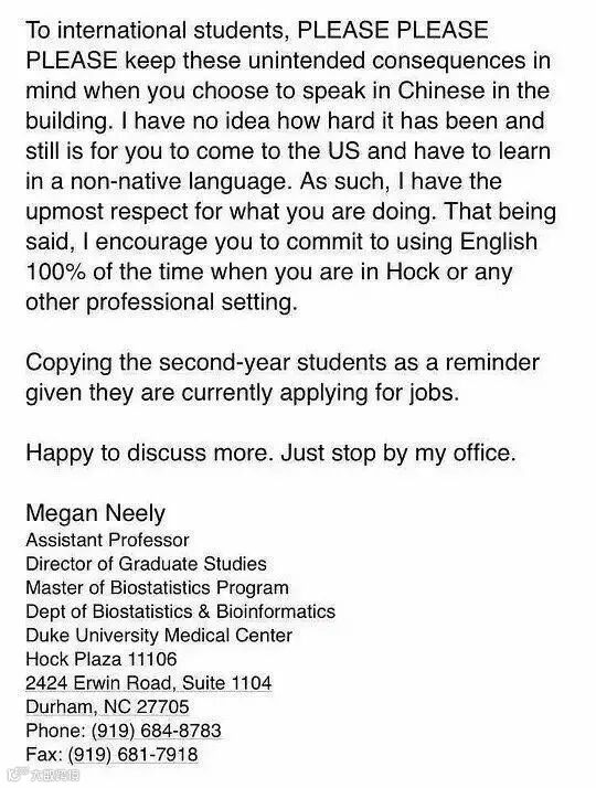 在中国留学生的强烈抗议下,杜克大学很快有了回应,生物统计院院长公开道歉,当事人Megan Neely辞去项目负责人的职务(其实是一个无关痛痒的职务)。