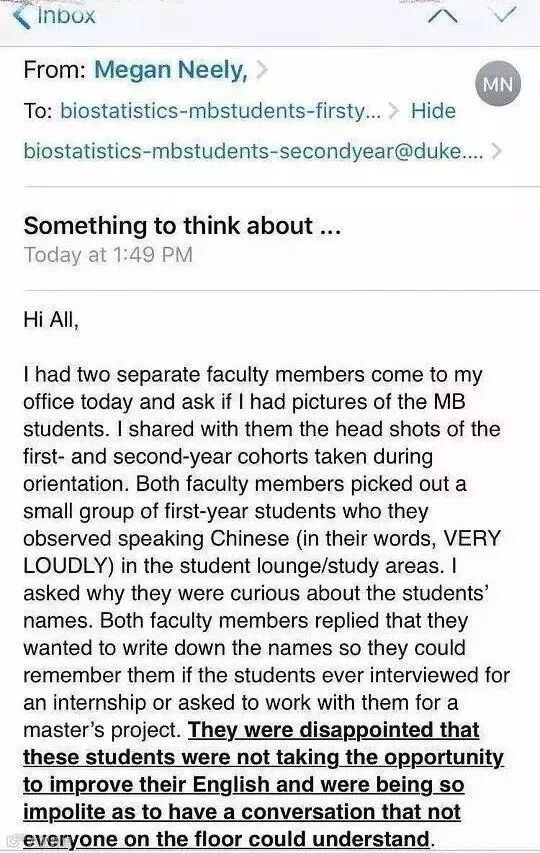 最近几天,中国留学生圈都在关注杜克大学事件。事情起源于杜克大学两位教职工在教学区看到“两名中国留学生用中文大声喧哗”,于是便向生物统计系项目负责人Megan Neely投诉,要“记在小本本上”。
