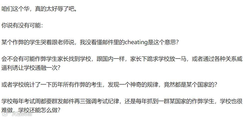 这个回答有两个致命的逻辑错误:一是同样有可能说别的语言的人也作弊,为什么要特别标注中文呢?二是中国留学生同样也是学习最勤奋的群体,以一部分人的作弊行为,来否定整个群体,对那些认真学习、诚实考试的中国留学生是否是公平的?如果说真正作弊的那些人,没有资格要求学校道歉,那么剩下的无辜学生们是否有资格要求?
