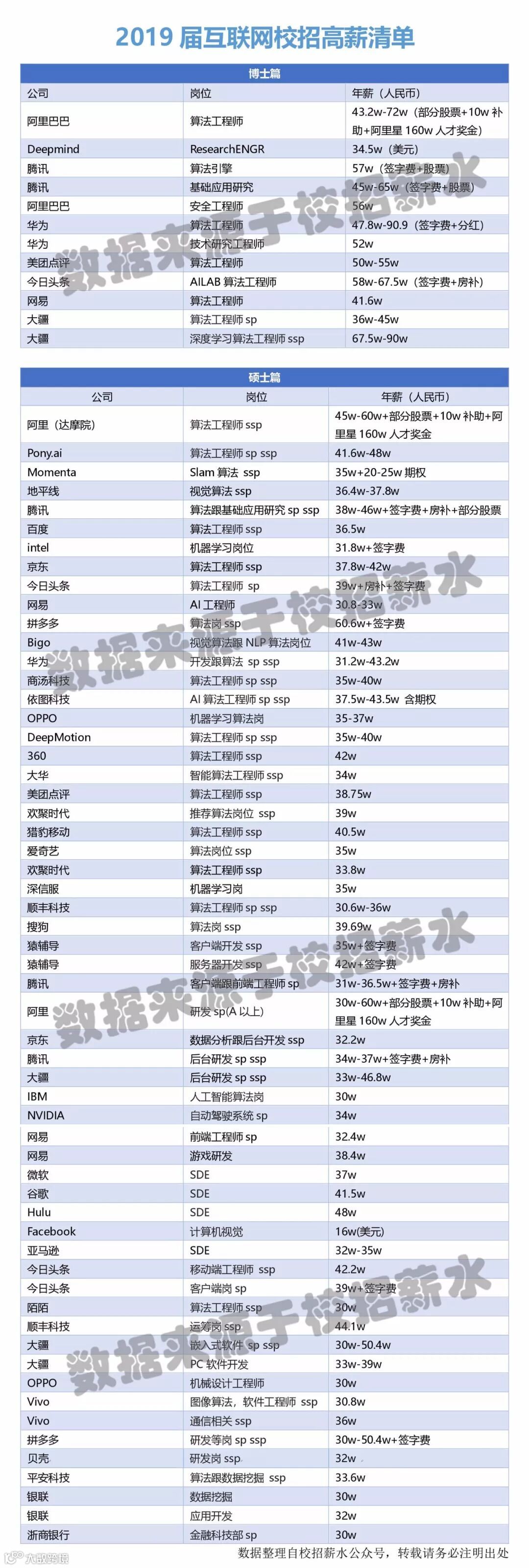不同以往,今年的互联网校招行情格外引人关注,还记得去年的2018届互联网校招高薪清单,30w的价格已经吸引足了名校学子的眼球,让众多学子有了一个互联网高薪梦,而今年,校招抢人才的热度升级了!房补,签字费,期权,人才补贴,股票等花样层出不穷,30w+已经不再是求职者高不可攀的薪资壁垒。