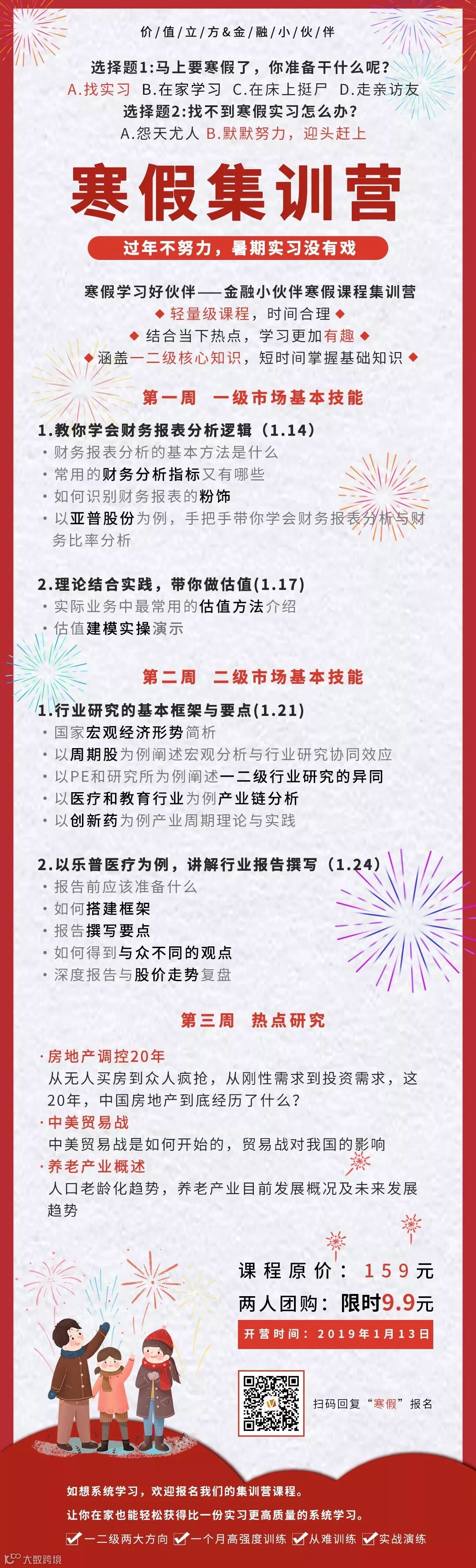 小金子 :为了让还“不认识”我们的同学,初步了解我们的课程,我们发起了9.9元拼团活动,只要从过年的红包里拿出一点点“启动资金”,就可以检验我们的课程质量啦。广东的朋友们也不用担心,串5个门就回本了对不对(我知道你们都习惯拿2块的红包了吧哈哈)。