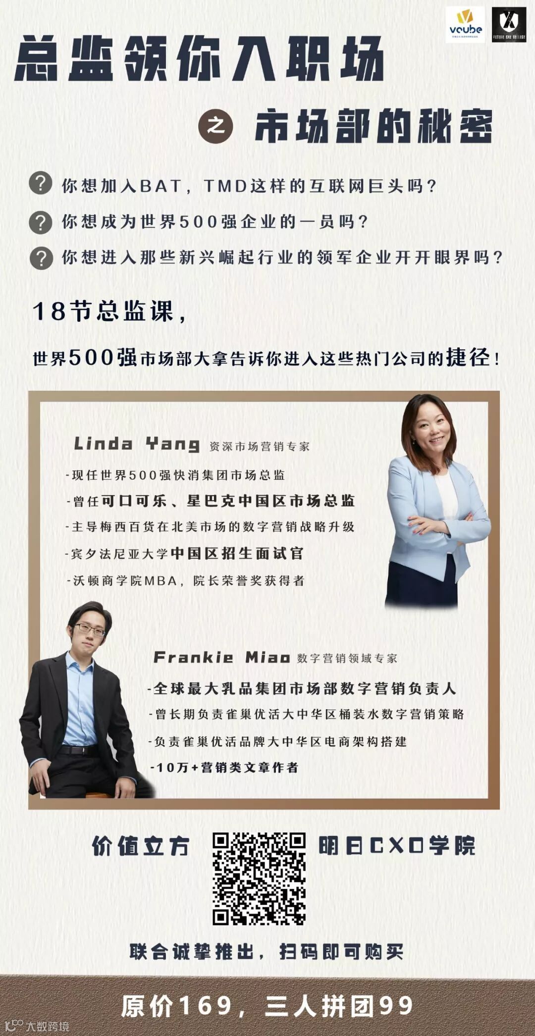本次快消课程由价值立方与明日EXO学院联手打造。明日EXO学院是一支由世界500强资深经理人组成的组织,旨在为行将和刚刚踏入求职之路的青年才俊提供综合考量个人兴趣、个人胜任力和行业发展前景的职业发展提升方案。