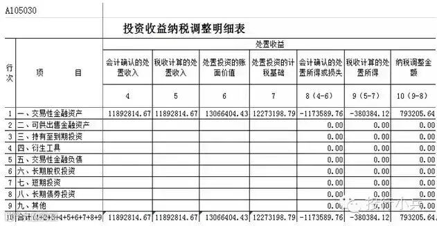 可以看出,在最终进行2014年所得税申报表的填报时,处置收益栏(详见下表):交易性金融资产会计确认的处置收入为11892814.67元,处置投资的账面价值为13066404.43元,会计确认的处置所得或损失为-1173589.76元;税收计算的处置收入为11892814.67元,处置投资的计税基础为12273198.79元,税收计算的处置所得为-380384.12元,纳税调整金额最终为703205.64元。