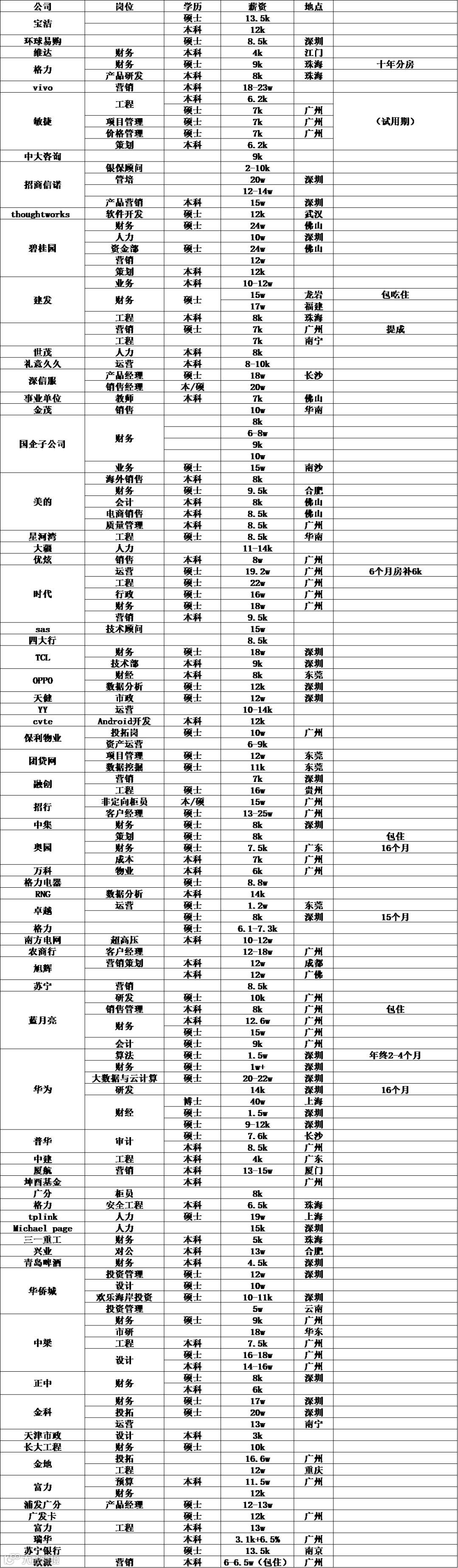 表单中的公司来自快消、金融、房地产、互联网、制造业等各个行业。薪酬按年薪计算从5W到40W不等,看来和行业有关,也和企业效益有关。