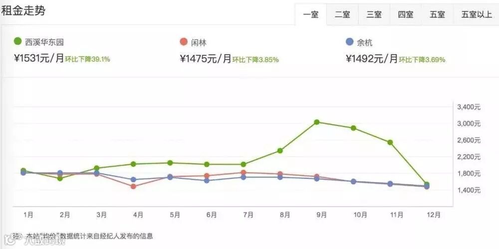 比如安居客数据显示,距离阿里西溪园区3公里左右的西溪华东园,除4室租金上涨6.53%外,其他户型的租金都有少量跌幅,尤其一室的降幅最为明显,环比下降了近40%。