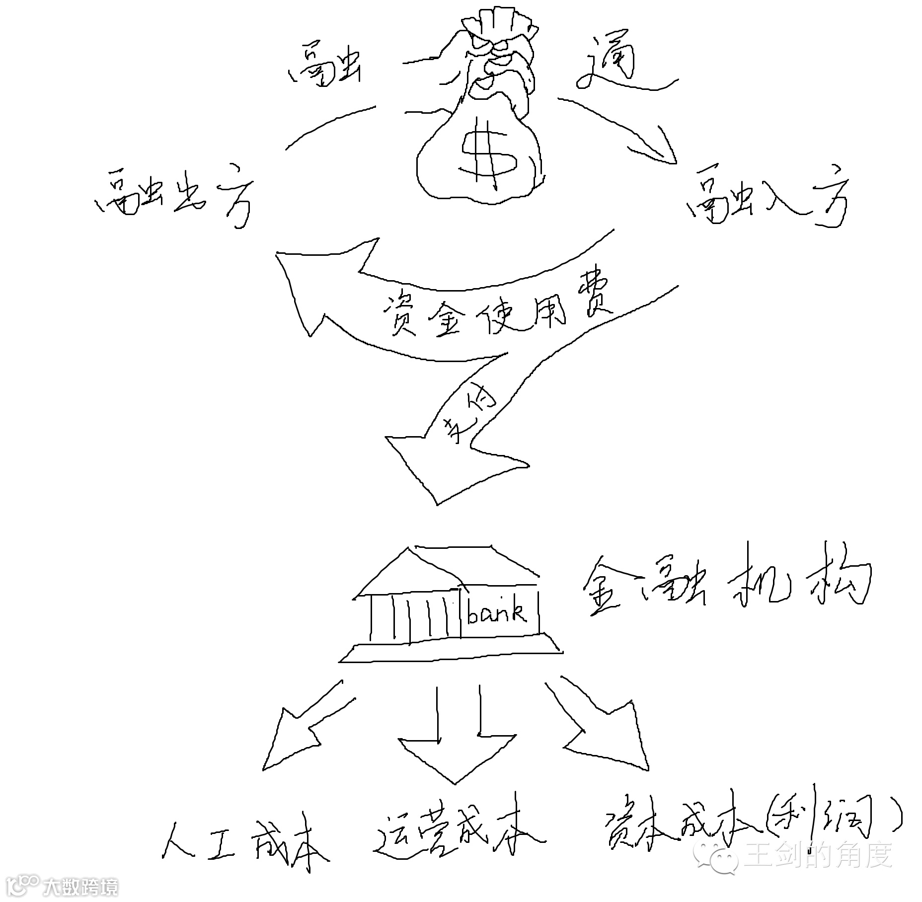 支付给金融业的服务费用,形成金融机构的收入,又分解为金融机构的:人工成本、运营成本、资本成本(也就是金融机构的利润)。