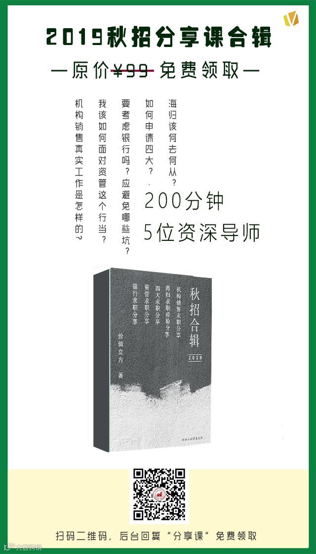 合辑分为五个方向,包括海归求职经验分享、四大求职分享、银行求职分享、资管求职分享、机构销售求职分享,在这里,你可以找到自己以及其他秋招“病友”最关心的问题。