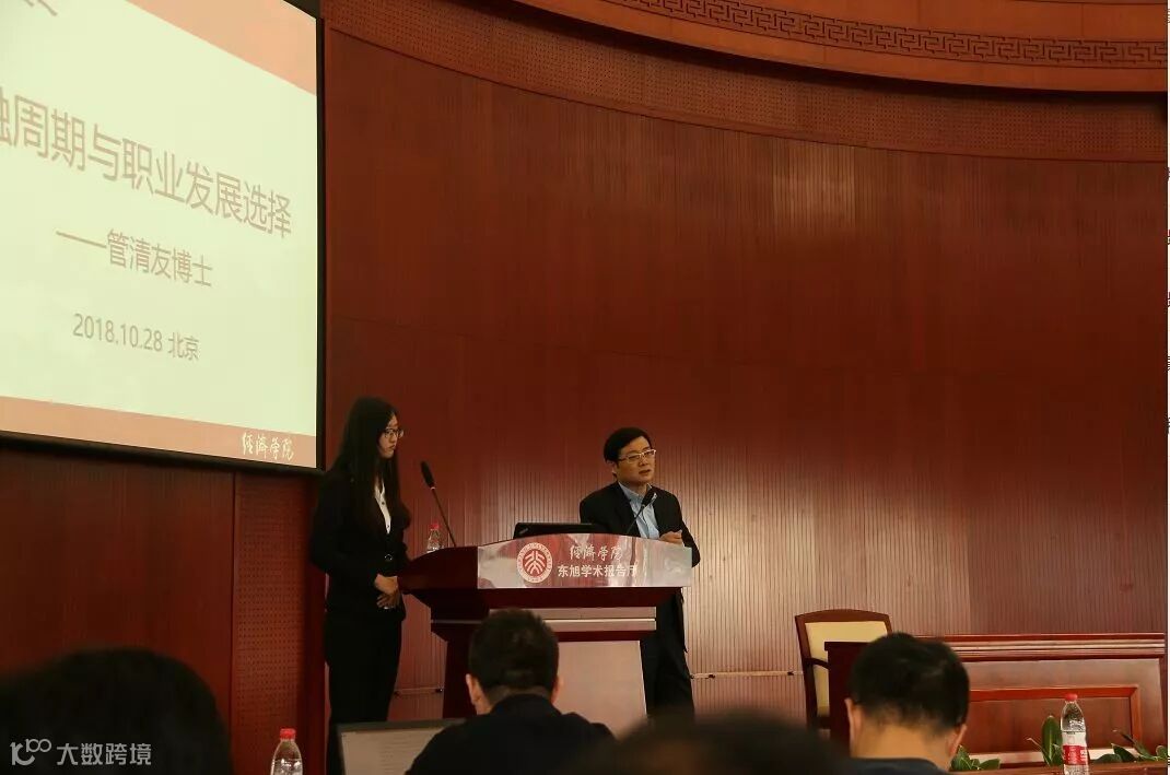 管清友老师,首先基于个人经历,亲切地拉进了与同学们的距离。对于他的学位,他幽默地解读到:“我当时就业情况也不太好,研究生找不到工作,就读博了,读了博士也找不到工作,只好再读博士后。”
