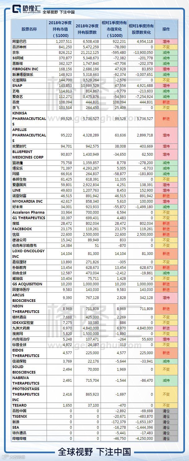 高瓴资本二季度新建仓的有:百度,诺亚,搜狐,Facebook等,其中百度买的最多,大概是1亿美金左右。增持了YY,SNAP等,嗯,还增持了伯克希尔哈撒韦。