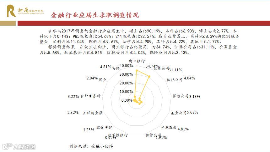 商业银行现在还是吸纳金融毕业生的最大口子,其次是券商,当然我估计在整个金融下行周期里面,这个格局会发生很大的变化。