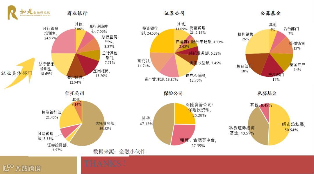 但是,统计数据上大家看,学校的分化还是非常明显的。同时我们看到就业去向上,还是去银行最多,因为银行规模最大,其次就是券商,依次我们来看,公募、私募、信托、保险,是这么一个特点。