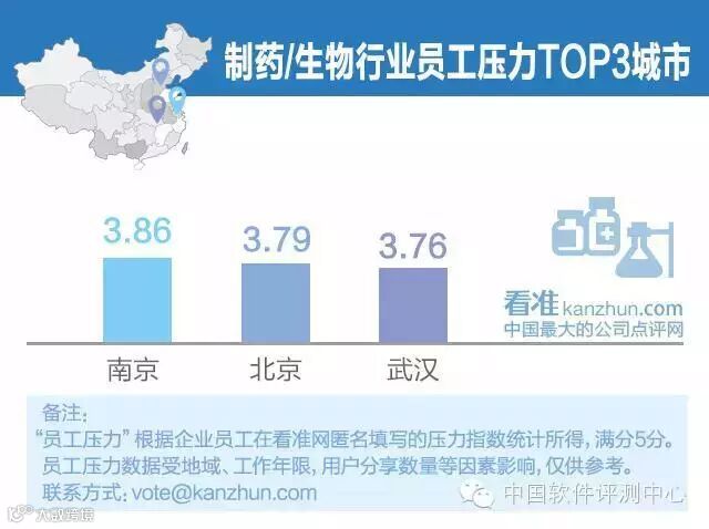 制药/生物行业,员工压力最大的行业分别是南京、北京、武汉。