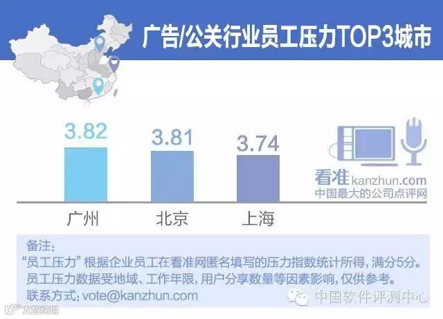 广告/公关行业,员工压力最大的行业分别是广州、北京、上海。