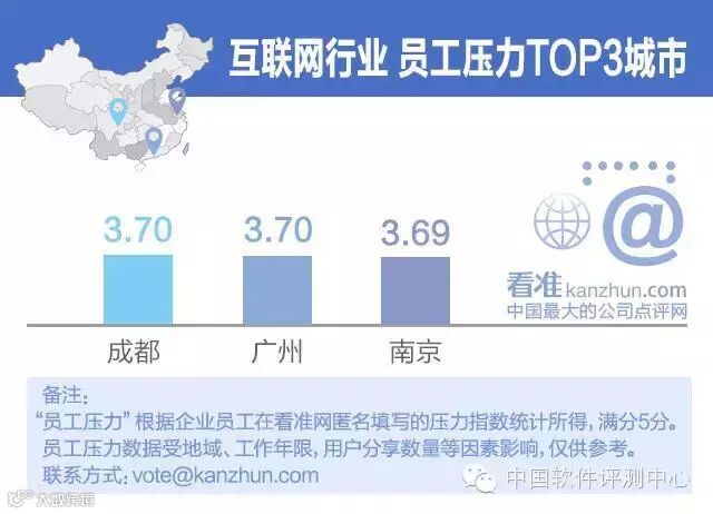 互联网行业,员工压力最大的城市分别是成都、广州、南京。