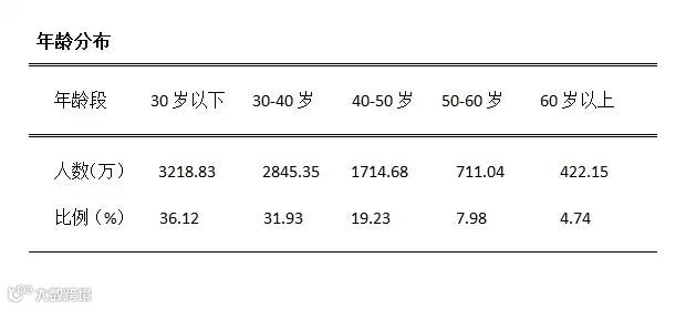 上证所数据显示,在上亿的股民大军中,年轻人成为炒股主力军,随着年龄的“增长”股民人数依次递减。调查显示,截至2013年年末,30岁以下证券投资人数3218.83万人,占比36.12%。30-40岁2845.35万人,占比31.93%;40~50岁1714.68万人,占比19.24%;50~-60岁711.04万元,占比7.98%;60岁以上422.15万人,占比4.74%。