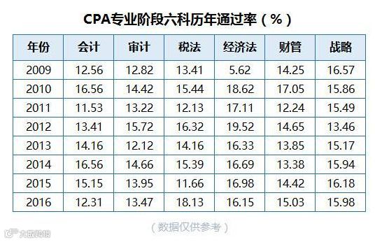 CPA的历年通过率在10%-20%,每年各科的通过情况有所波动,存在大小年变化: