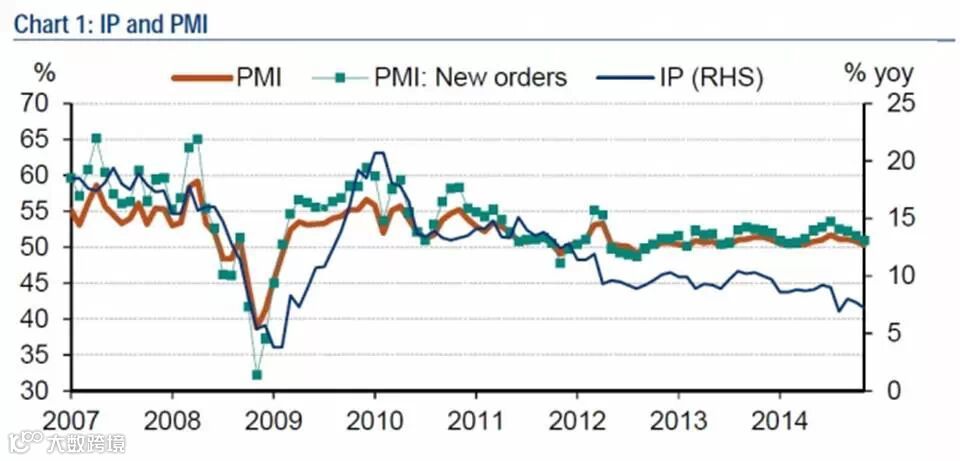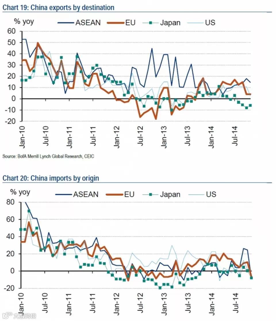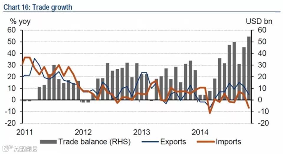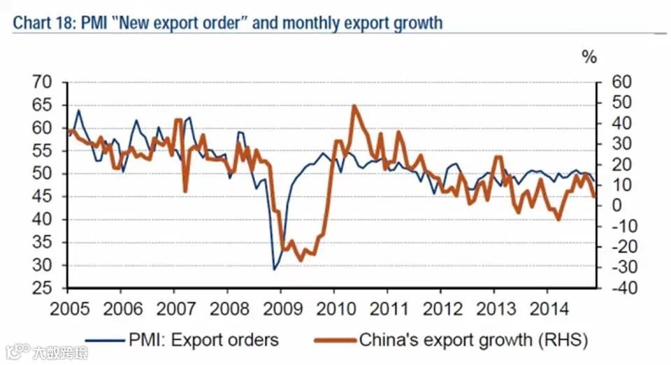 14. 11月新增出口订单PMI跌至48.4,或受2014年人民币名义有效汇率升值影响。11月出口增长跌至4.7%,前值11.6%。