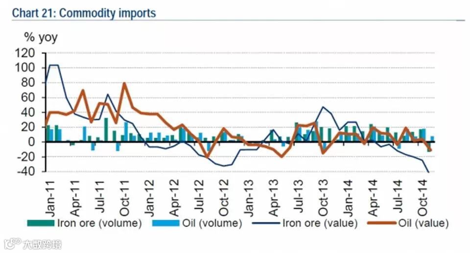 16. 11月铁矿石和铜进口总量同比分别减少13.4%和3.6%,原油进口总量同比增长7.9%。从价值来看,铁矿石、铜和原油的进口总额11月同比分别下跌46.2%、9.8%和10.9%。