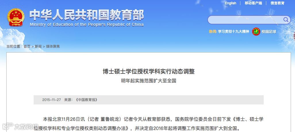 据中国教育报报道,2015年,国务院学位委员会下发《博士、硕士学位授权学科和专业学位授权类别动态调整办法》,并决定自2016年起将调整工作实施范围扩大到全国。