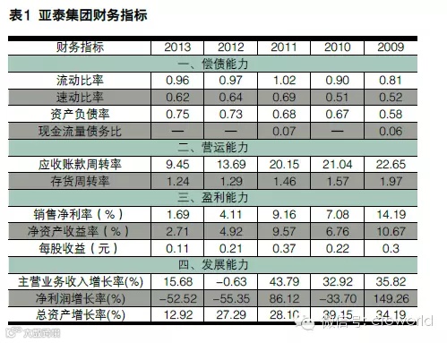 为了全面分析亚泰集团财务状况,本文收集了2009—2013年亚泰集团的相关财务数据,并计算出关键财务指标,相关数据见下表1