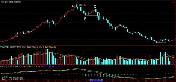 下图是上证指数最著名的一蹶不振图谱。从历史最高点6124下跌到4800点,然后反弹到5500点无力创出新高,然后跌破4800点,著名的历史大牛市结束。此时如果知道一蹶不振这个趋势改变的图谱,卖出并空仓等待,一点都不晚。最终跌倒1624点才开始大反弹。