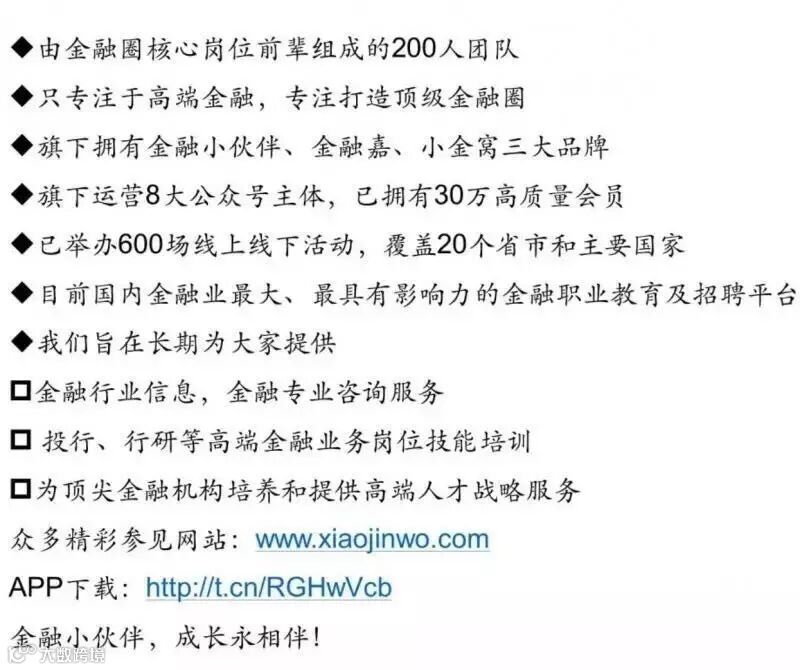 金融小伙伴致力于搭建一个金融垂直领域职业信息分享和交流公益平台,通过持续不断的公众号推文和线上线下活动,提供及时、全面、高效的行业招聘信息和职场提升经验。目前,我们已吸引了超过100万粉丝,在海内外金融学子和在职人士中均享有盛誉。