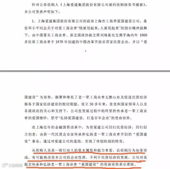 例如,作为老一辈工商业者创办的改革开放后首家民营企业,始终坚守“爱国建设”宗旨,传承老一辈工商业者爱国情怀,在上海近年的金融国资改革中,为使爱建公司回归民营经济,回归创立初衷,新一代民营企业家(即均瑶集团)传承和弘扬了老一辈工商业者事业,而从收购人(广州国资委旗下广州基金)资本属性和能力来看,收购行为若完成,有可能改变公司企业性质,不利于民营经济发展,因此,对其是否能传承和弘扬老一辈工商业者“爱国建设”的使命宗旨表示怀疑。